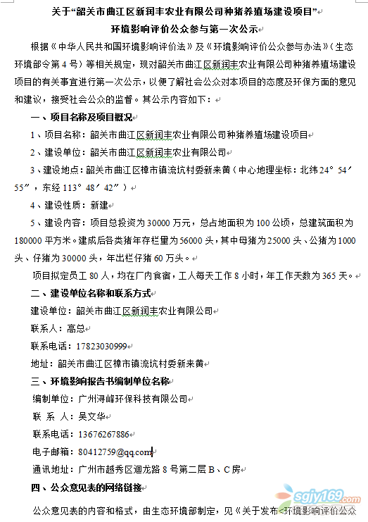 關于“韶關市曲江區(qū)新潤豐農業(yè)有限公司種豬養(yǎng)殖場建設項目”環(huán)境影響評價公眾參與第一次公示